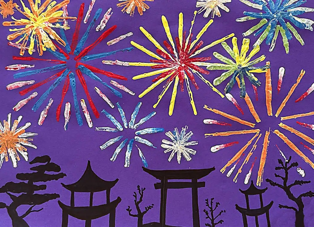 Fireworks are common during Lunar New Year because it is thought the loud noise and bright lights will drive away evil spirits and bad luck, welcoming good fortune, prosperity, and renewal for the new year. For this reason, my students create a landscape with colorful fireworks in the sky to show this wonderful tradition. My students begin drawing silhouettes of buildings and trees found throughout Asia. I provide them with a Landscape Ideas handout to get them started. Next, they fill the sky with colorful fireworks. We use cardboard pieces dipped in paint and create a radial burst of color. We double-dip to make multicolored fireworks, as well as use overlapping and size to create depth in the firework display. My students have a BLAST with this lesson.